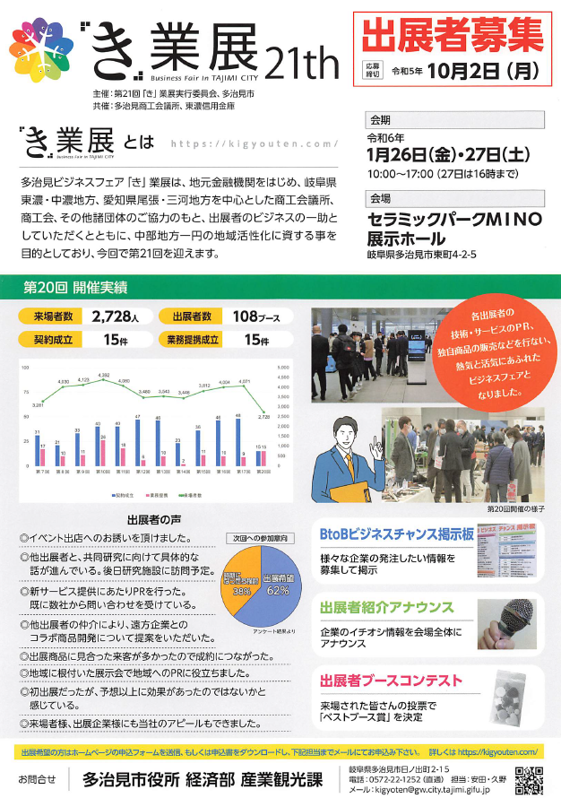 多治見市では、地元金融機関をはじめ、岐阜県東濃・中濃地方、愛知県尾張・三河地方を中心とした商工会議所、商工会、その他諸団体のご協力のもと、出展者のビジネスの一助としていただくとともに、中部地方一円の地域活性化に資する事を目的とする、第21回「き」業展を開催します。