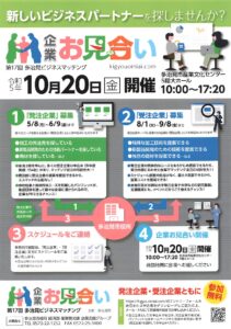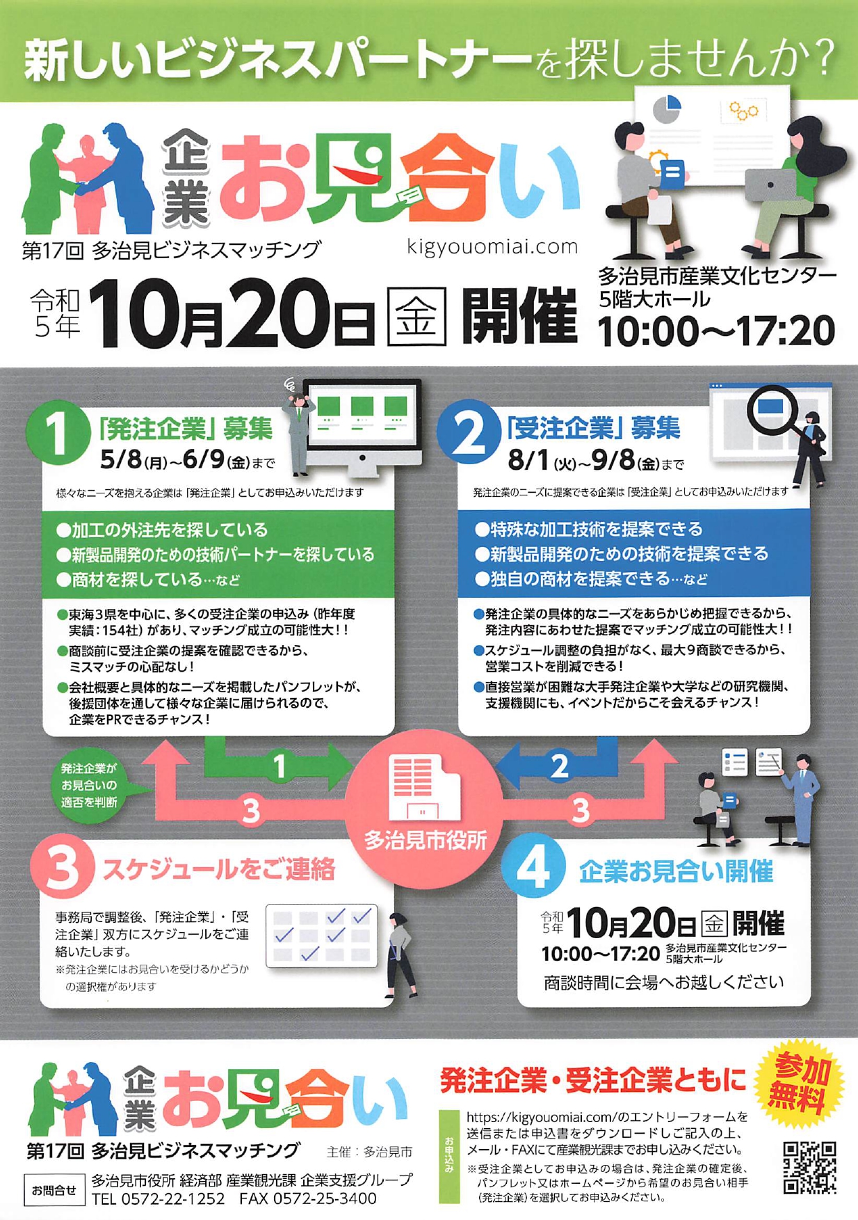 【イベント情報】第17回多治見ビジネスマッチング「企業お見合い」10月20日(金)開催について 多治見市では、令和5年10月20日(金曜日)に、第17回多治見ビジネスマッチング企業お見合いを開催します。 開催スケジュール・概要は下記になります。 詳細はこちら