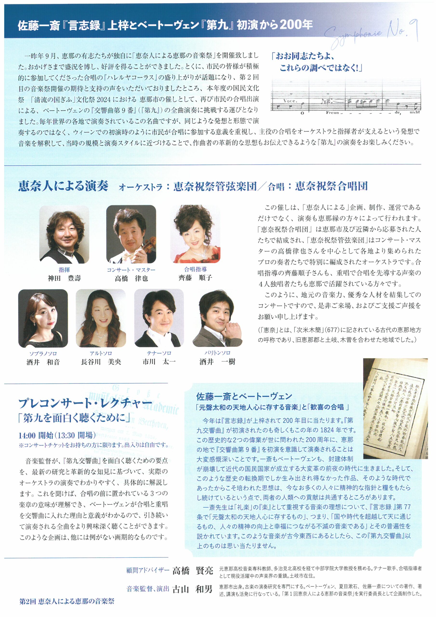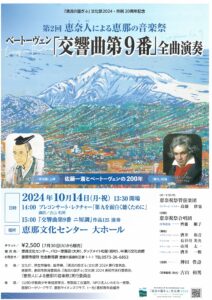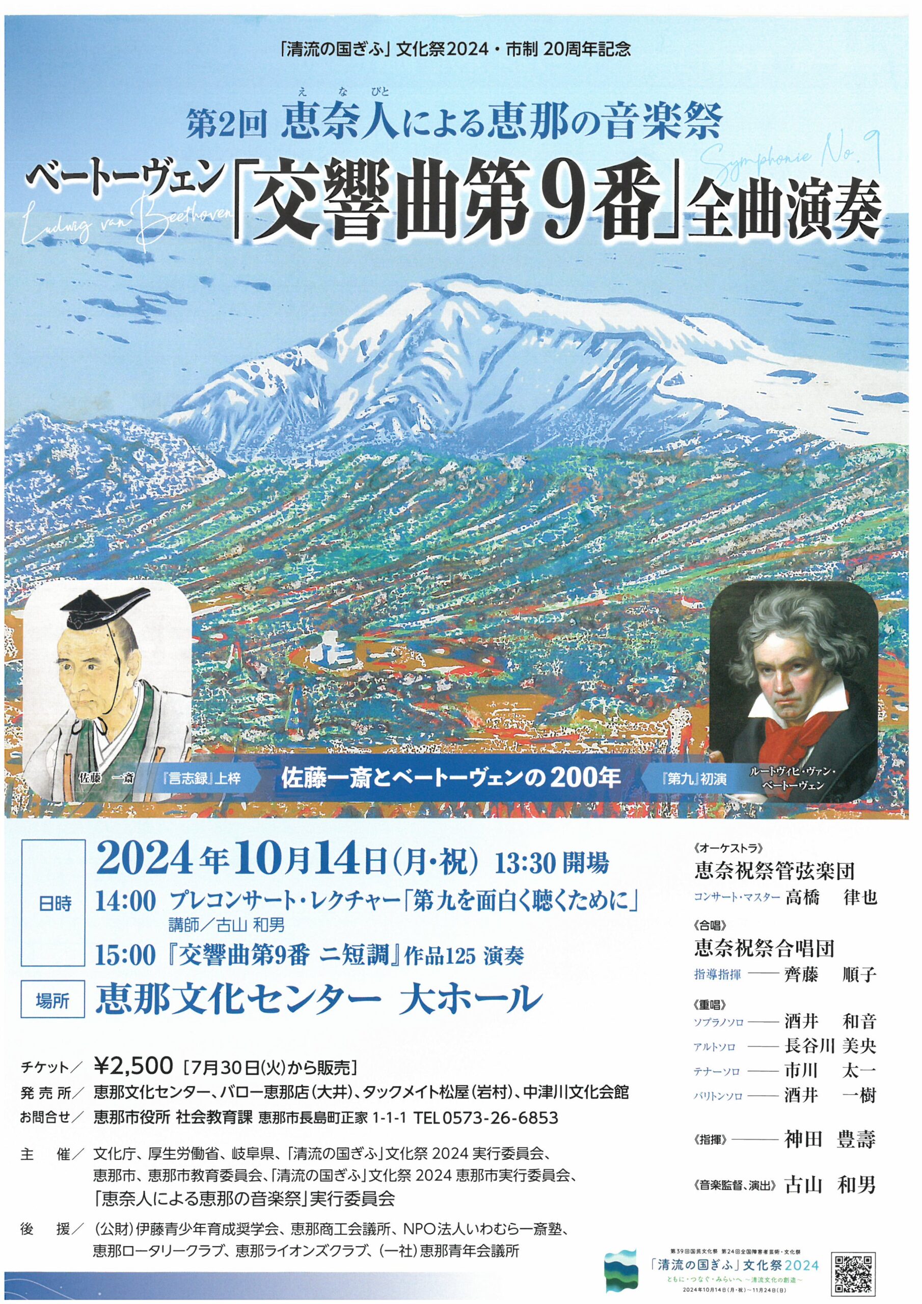 【イベント情報】第2回恵奈人による恵那の音楽祭のご案内 恵那市では、恵那市民を中心に参加者を募り、オーケストラの演奏に合わせてベートーヴェンの「交響曲第九番」の合唱を披露する市民参加型の音楽イベントを開催します。『第九』を面白く聴くためのレクチャー講演も開催します。 詳細はこちら 開催期間 2024年10月14日(月祝) 開催時間 14時00分~16時15分 開催場所 恵那文化センター (恵那市長島町中野414-1)