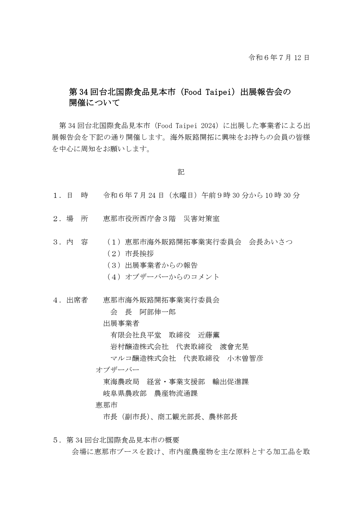 恵那市では、第34回台北国際食品見本市(Food Taipei 2024)に出展した事業者による出展報告会を下記の通り開催します。