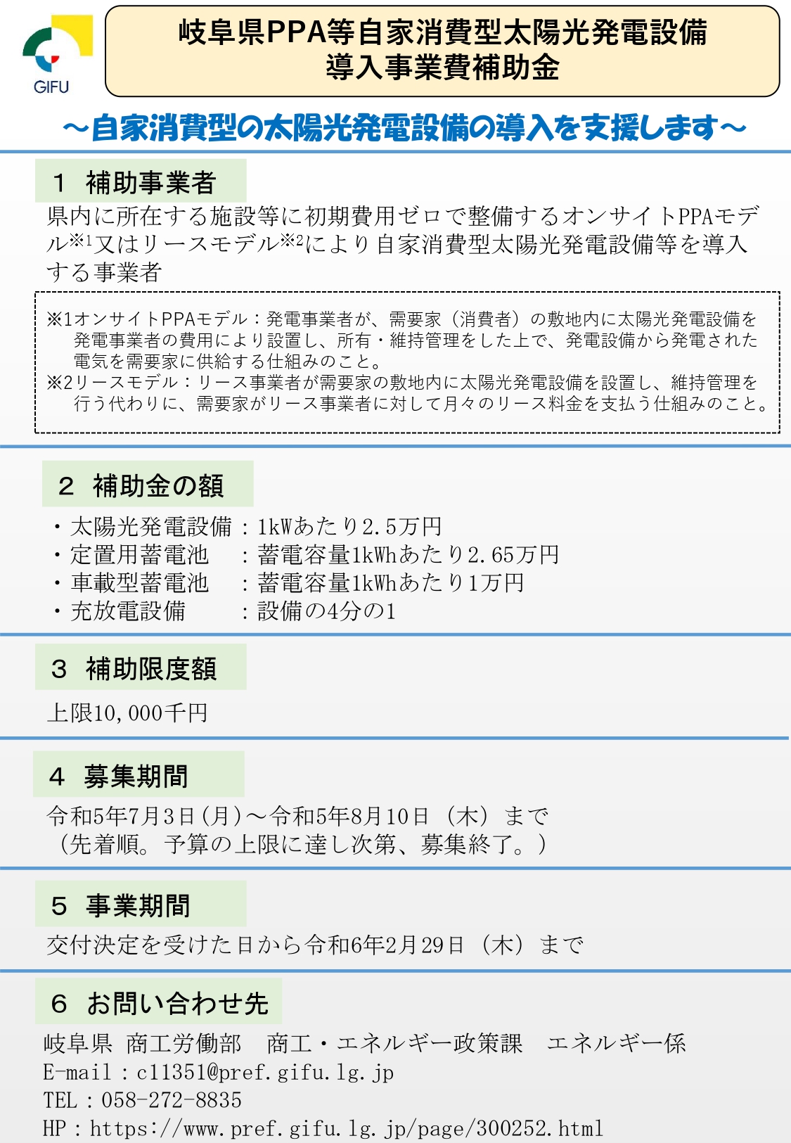 【補助金・助成金情報】「岐阜県PPA等自家消費型太陽光発電設備導入事業費補助金」の募集について 岐阜県では、電気料金への高騰等への対応と、脱炭素社会の実現に向け、自家消費型の太陽光発電設備等の導入を支援する標記補助金の募集を下記のとおり開始しますのでお知らせします。 詳細はこちら