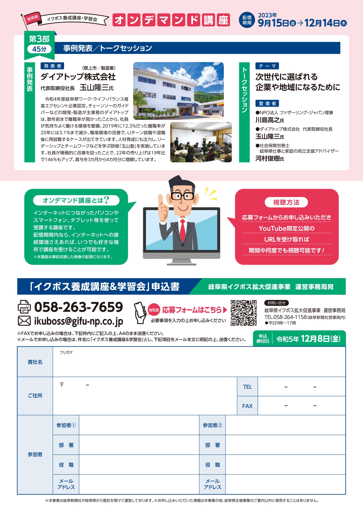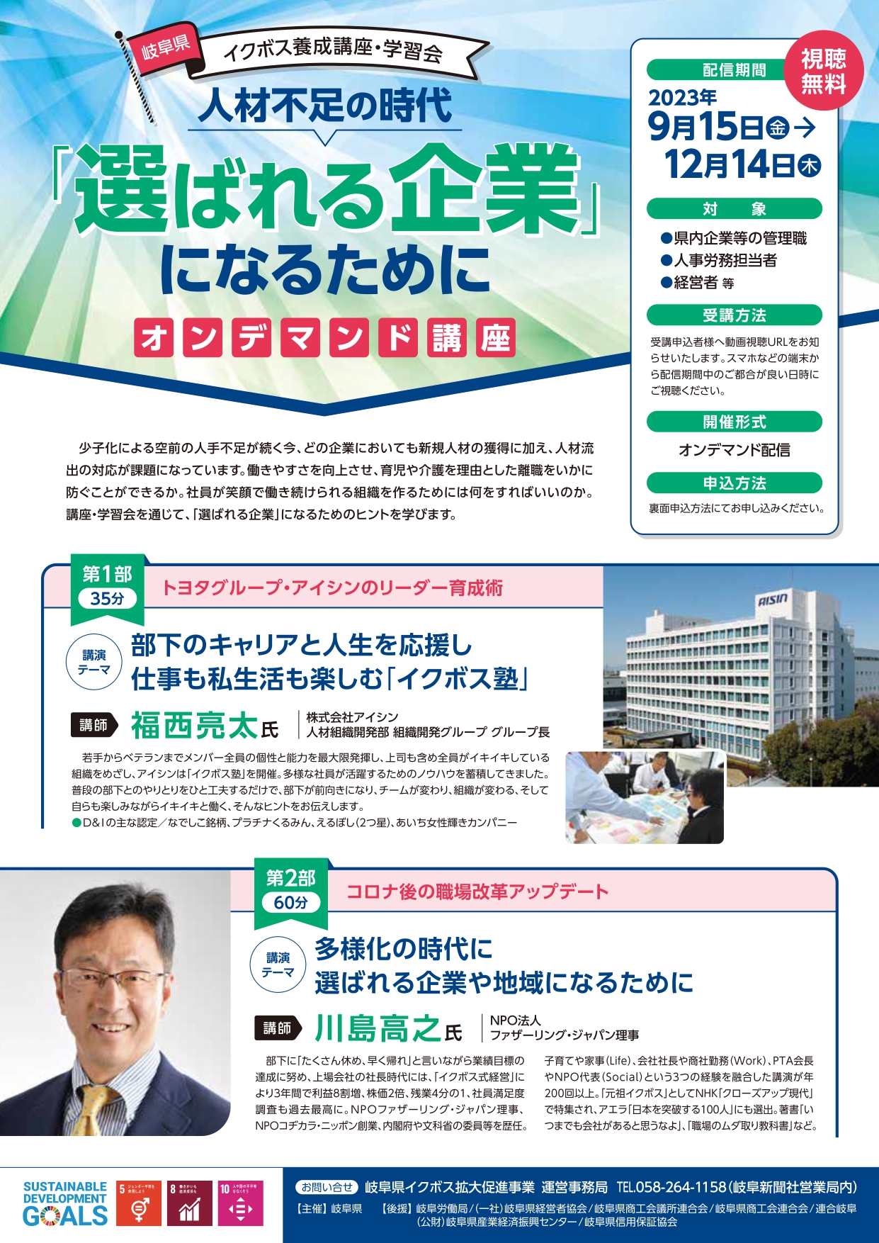 【講習・研修会】「 イクボス養成講座・学習会」のご案内 岐阜県では、職場で共に働く部下のワーク・ライフ・バランスを考え、その人のキャリアと人生を応援しながら、組織の業績も結果を出しつつ、自らも仕事と私生活を楽しむことができる経営者や管理職「イクボス」を増やすことを目的に、「イクボス養成講座・学習会」を下記のとおり申込者限定で配信します。 多くの方のお申込みをお待ちしています。 詳細はこちら