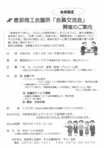 【会議所情報】「会員交流会」開催のご案内 当所では、「経済を中でまわし、三方よしの恵那を築く」をコンセプトに、様々な業種の参加者と交流し、「仕事への想い」を語り合い、親睦を深め、「人脈拡大」「ビジネスの仲間」「取引先の開拓」など、販路拡大へと繋げる情報収集の場へお気軽にぜひご参加ください。