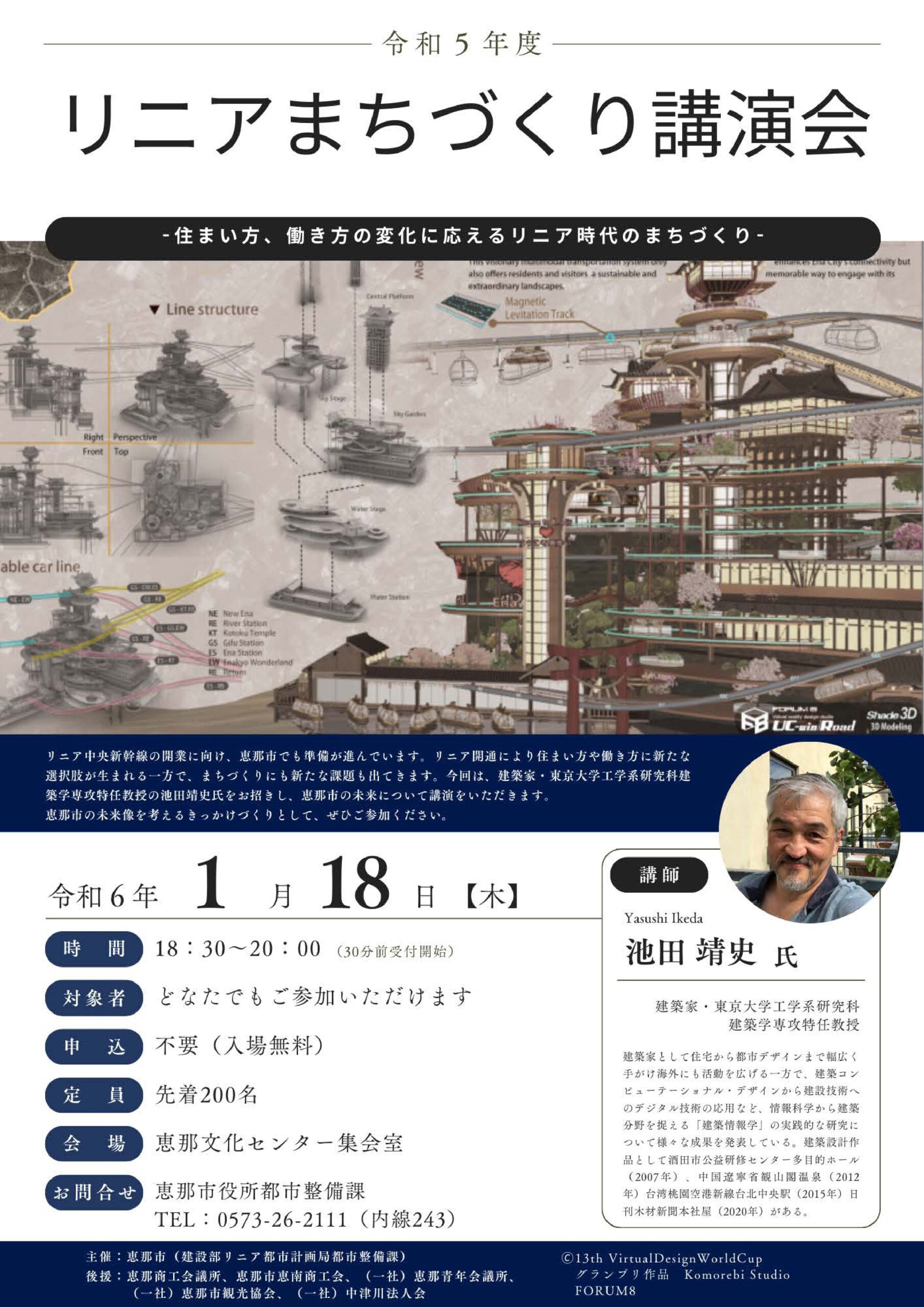 【講習・研修会】リニアまちづくり講演会について 恵那市では、リニア中央新幹線の開業に向け、準備が進んでいます。今回は建築家・東京大学工学系研究科建築学専攻特任教授の池田晴史氏をお招きし、恵那市の未来について講演をいただきます。
