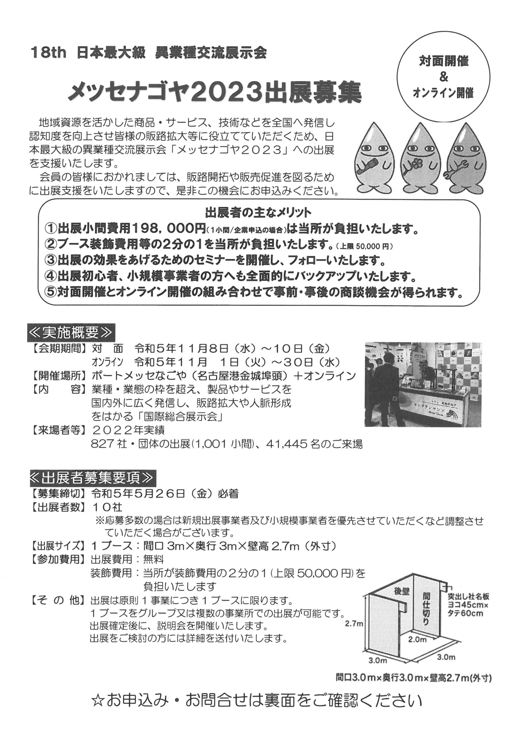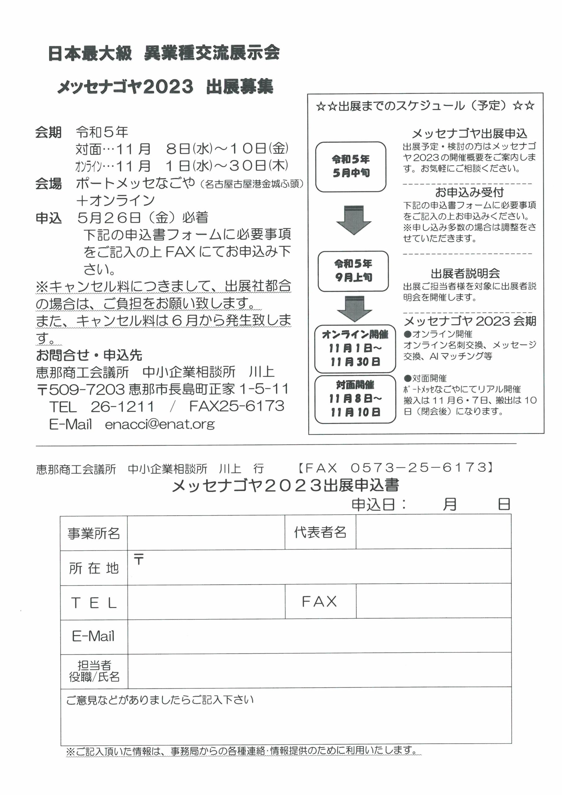 【イベント情報】メッセナゴヤ2023出展募集について 恵那商工会議所では、地域資源を活かした商品・サービス、技術などを全国へ発信し認知度を向上させ皆様の販路拡大等に役立てていただくため、日本最大級の異業種交流展示会「メッセナゴヤ2023」への出店を支援いたします。 会員の皆様におかれましては、販路開拓や販売促進を図るために出展支援をいたしますので、ぜひこの機会にお申し込みください。