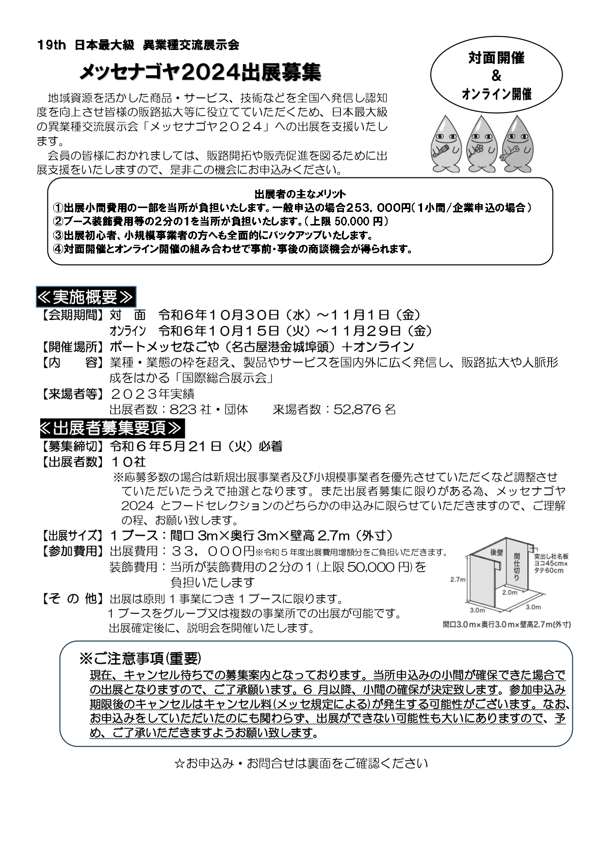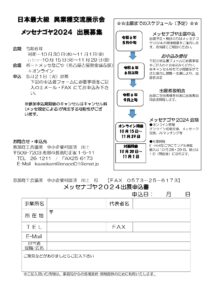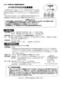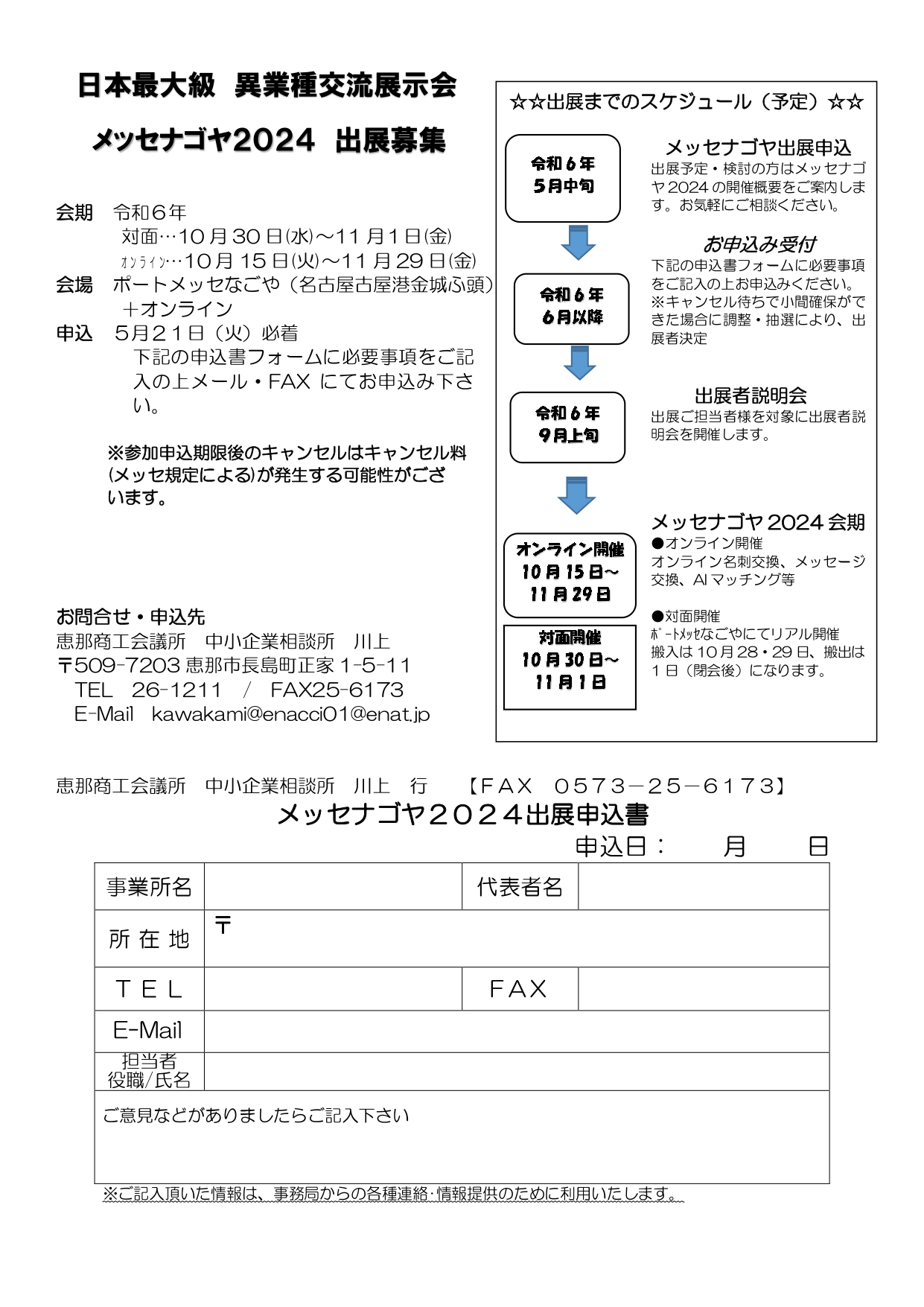 【イベント情報】メッセナゴヤ2024出展募集が開始されました 恵那商工会議所では、地域資源を活かした商品・サービス、技術などを全国へ発信し認知度を向上させ皆様の販路拡大等に役立てていただくため、日本最大級の異業種交流展示会「メッセナゴヤ2024」への出展を支援いたします。 会員の皆様におかれましては、販路開拓や販売促進を図るために出展支援をいたしますので、是非この機会にお申込みください。