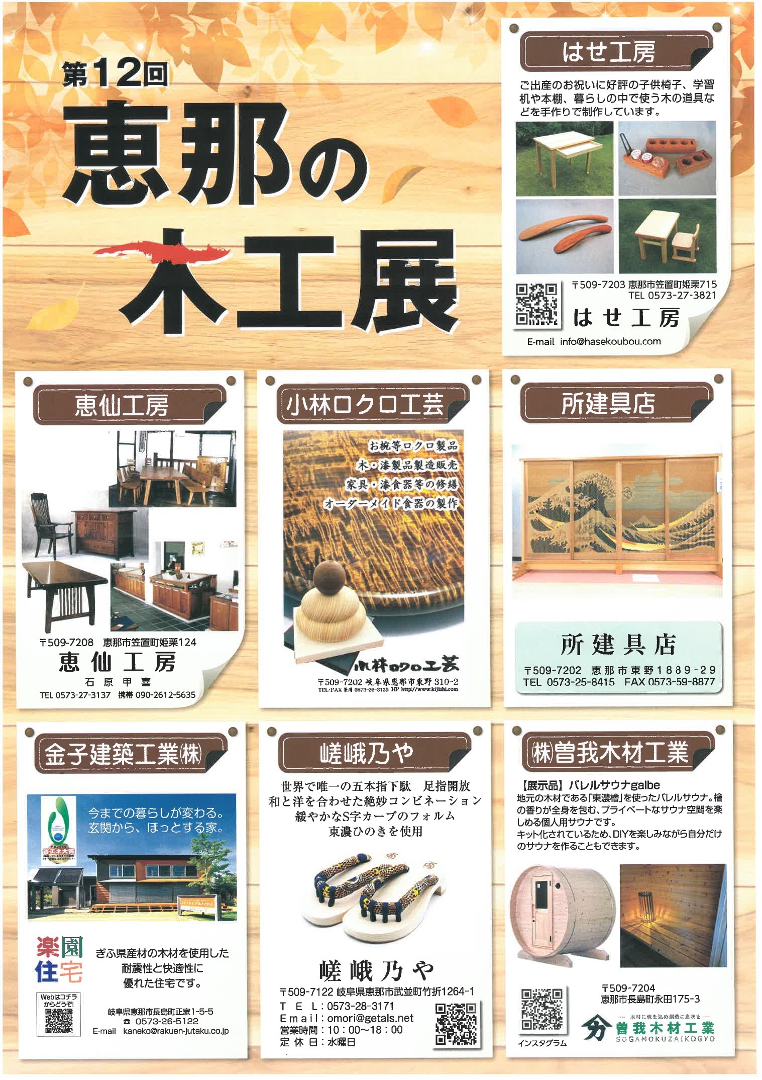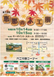 【イベント情報】「第12回恵那の木工展」を開催します 当所木材木工業部会では、標題のとおり恵那が育む木の文化を紹介するために「第12回恵那の木工展」を開催いたします。 12回目となる今回は地元の木工職人による木工製品等の展示や木工体験コーナー、恵那の木工業のPRや自社製品のPR及び販路拡大の為の展示を行います。 ぜひご参加ください。 【日時】 令和5年10月14日(土)9:30~17:00 令和5年10月15日(日)9:30~16:00 【場所】 キーポイント 大ホール(恵那市長島町正家613-10) 【主催】 恵那商工会議所 木材木工業部会