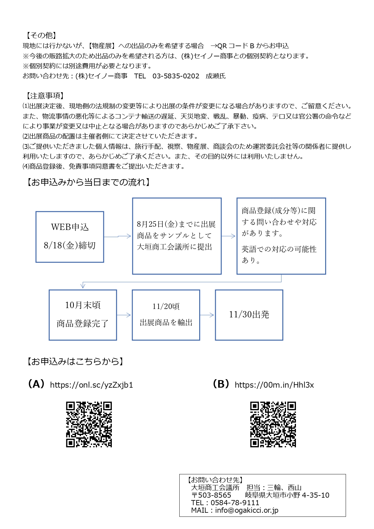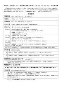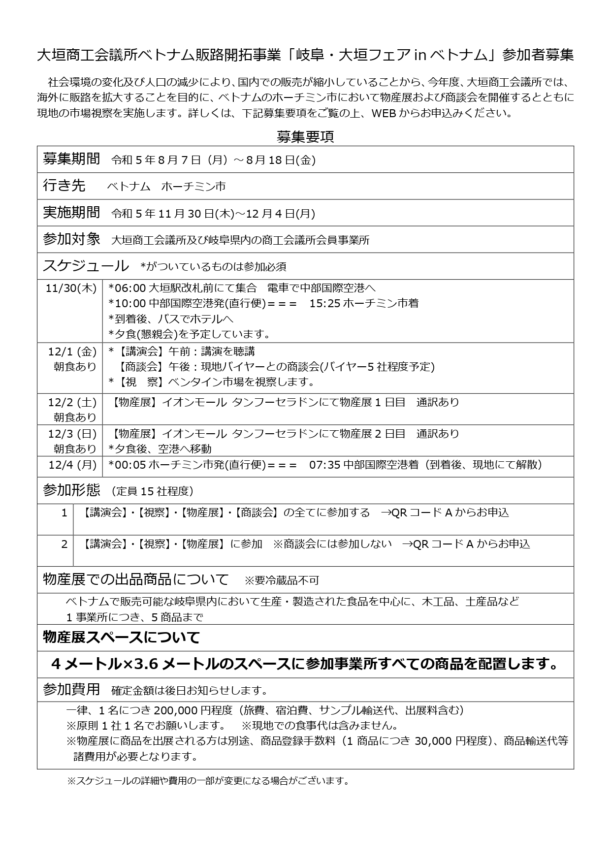 【イベント情報】大垣商工会議所ベトナム販路開拓事業「岐阜・大垣フェアin ベトナム」参加者募集 大垣商工会議所では、社会環境の変化及び人口の減少により、国内での販売が縮小していることから、今年度、海外に販路を拡大することを目的に、ベトナムのホーチミン市において物産展および商談会を開催するとともに現地の市場視察を実施します。 詳しくは、下記募集要項をご覧の上、WEB からお申込みください。