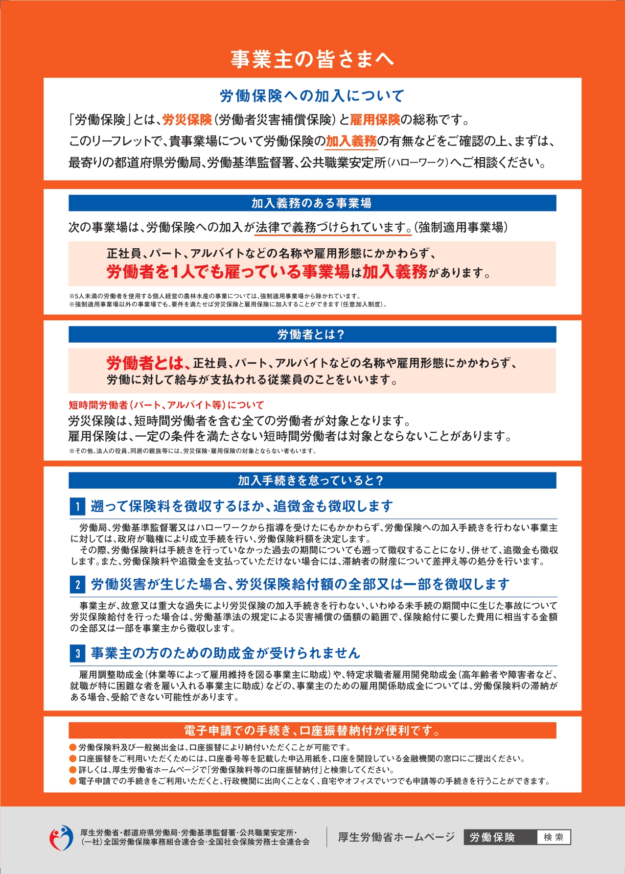 まだ、加入手続がお済みでない事業主は、労働者が安心して働ける職場づくりと安定した事業経営を図るため、所轄の労働基準監督署・公共職業安定所(ハローワーク)にて加入手続を行ってください。