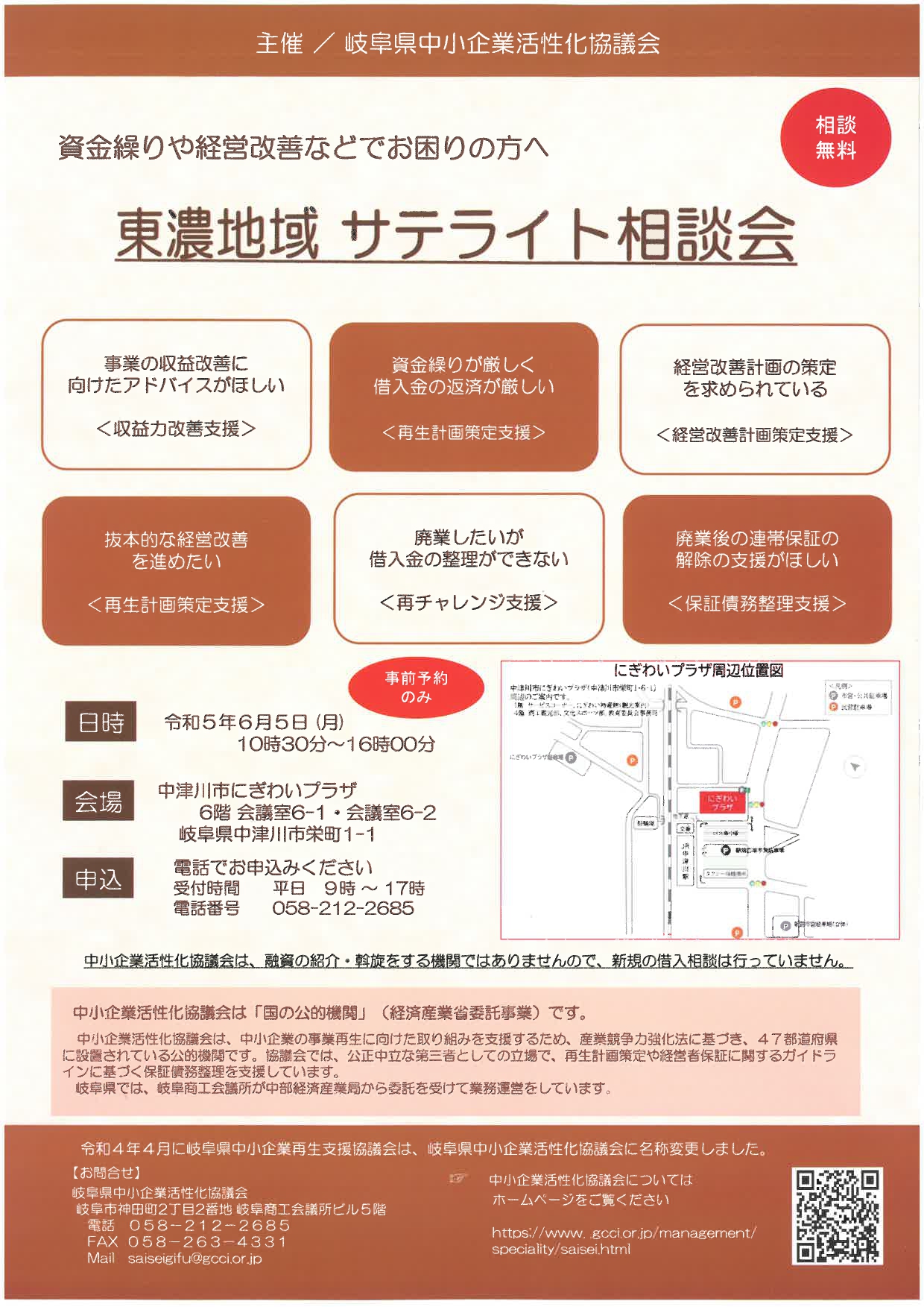 岐阜県中小企業活性化協議会(旧岐阜県中小企業再生支援協議会)では、資金繰りや経営改善などでお困りの方へ向けて下記のとおり相談会を開催いたします。