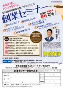 【講習・研修会】創業セミナーを開催します 当所では10月より全5回の創業セミナーを開催します。 【会場】 恵那商工会議所 【時間】 各回 18:00~21:00 【内容】 第1回 10月11日(火)創業する市場を分析する 第2回 10月25日(火)創業のための事業アイデアとビジネスモデル 第3回 11月10日(木)創業する前に知っておきたい儲けの仕組みと資金繰り 第4回 11月16日(水)戦略マップを使った経営戦略づくり 第5回 11月30日(水)創業のための事業計画書作成 【お申込み】 電話・FAX・メールのいずれかで承ります