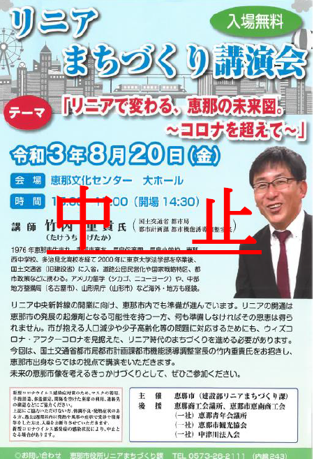 【中止連絡】リニアまちづくり講演会 令和3年度8月20日(金)に予定しておりました、リニアまちづくり講演会ですが、新型コロナウィルス感染拡大に伴いまして中止になりました。 ご不明な点等など御座いましたら、恵那市役所リニアまちづくり課までご連絡ください。 電話番号:0573-26-2111(内線243)